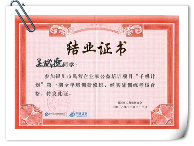 伊百盛吳斌德“千帆計劃”培訓合格結業證書