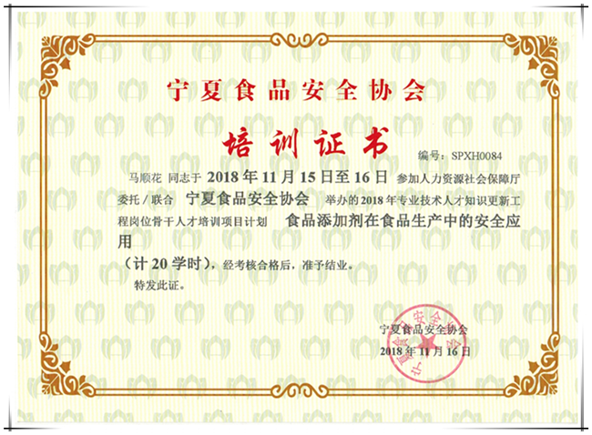 寧夏食品安全協會培訓結業證書