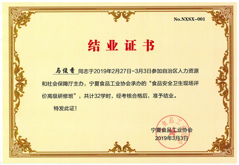 品質主管馬俊香參加“食品安全衛生現場評價高級研修班“順利結業