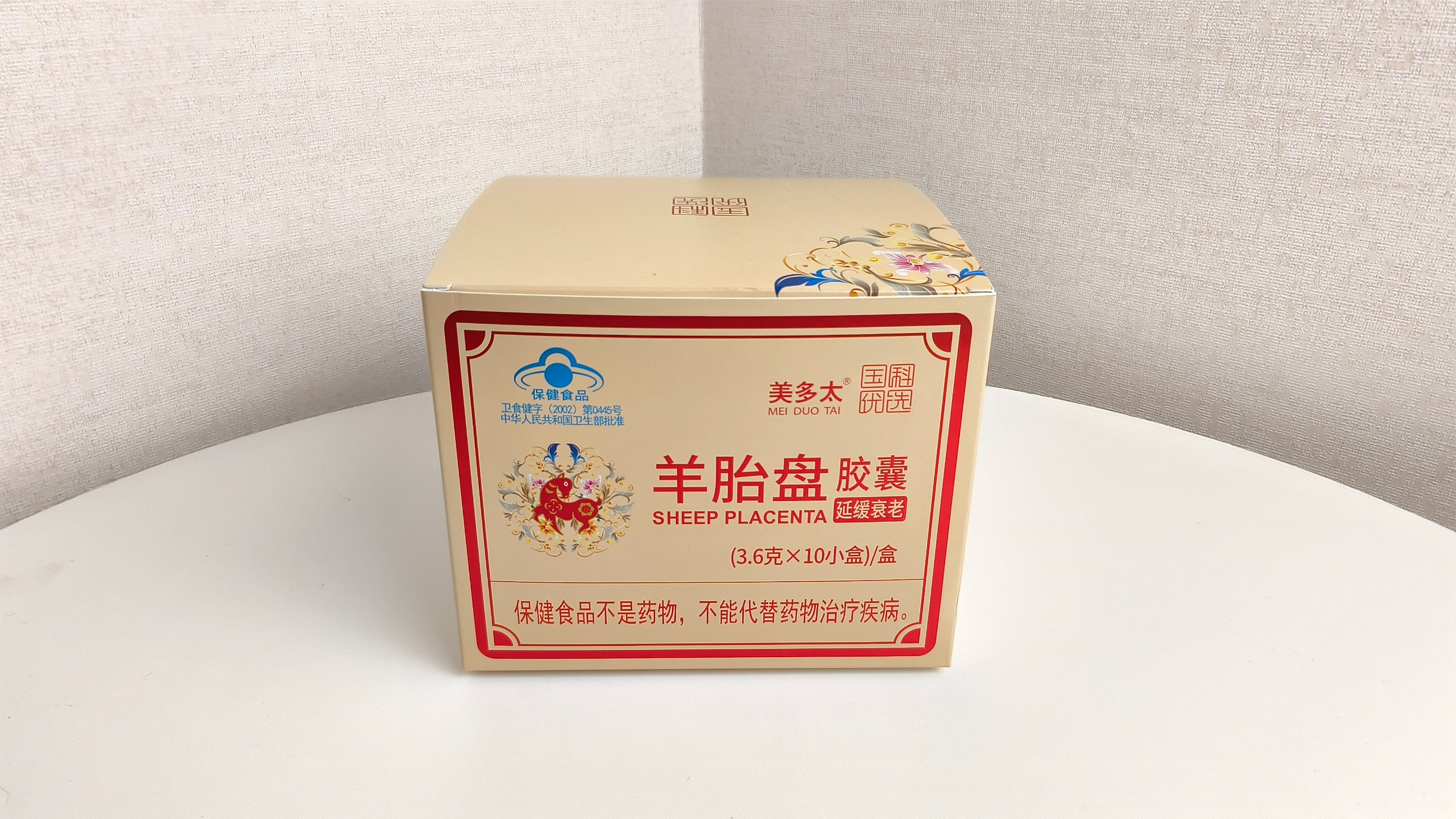 本品是以羊胎盤、淫羊藿、菊花、紅花為主要原料制成的保健食品,經(jīng)功能試驗(yàn)證明,具有延緩衰老的保健功能
